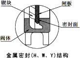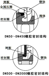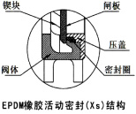 | ■ EPDM橡胶密封 EPDM橡胶密封原理是采用橡胶密封圈与闸板和锲快组合成密封副,当启闭件在外力的作用下带动闸板向下移动,阀门处于敢比状态时,是闸板下单斜面与阀体中锲块上的斜面想吻合,迫使闸板紧靠橡胶密封圈进行强制密封,其结构如右图所示:  ■ EPDM橡胶活动密封 阀座压盖压住橡胶密封圈在阀体上,适用寿命长,密封圈更换安装方便。本结构适用于开关次数频繁,粉状类介质管道输送。 ■ 金属密封 本结构适用于粉状、颗粒、煤渣、泥浆等介质,适用于管道内漏充分许可的情况下,不适用于清水介质。 ■ 金属活动密封副 采用金属密封圈与阀座压盖为球面衬合,工作时密封圈在不同受力的状态下可以在阀体内做适当的球弧状滑动。闸板受压越大,密封性能越好,此密封能实现闸板与密封圈完全密封状态,达到零泄漏,同时闸板在启闭过程中,密封面处于无摩擦区域,延长阀门使用寿命。  PTFE四氟活动密封阀座压盖压住四氟密封圈在阀体上,并在中间放置橡胶O型圈,防止介质从阀座压盖出外泄,四氟密封圈更换安装十分方便。 |  |