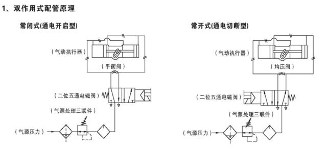 单作用式(弹簧复位):挡电信号或气源发生故障时,能利用弹簧因压缩而积蓄的能量对阀门实现开启或关闭。