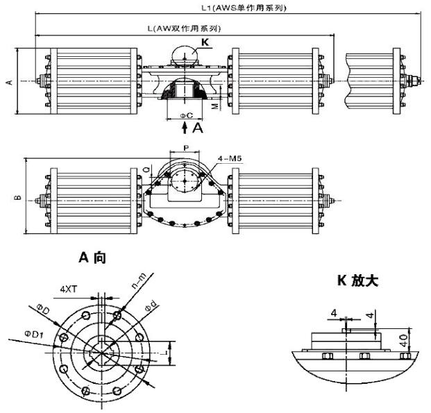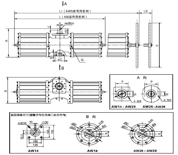 1、AW气动执行器分为双作用式和单作用式(弹簧复位),两个分体气缸,容易制造大尺寸缸体,满足各种大口径角行程类阀门的要求。